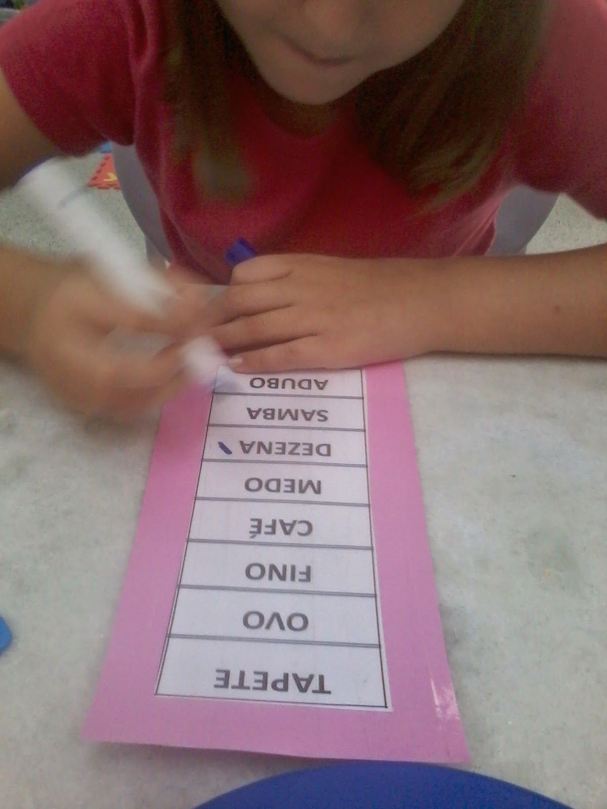 Utilizamos os mesmos procedimentos citados acima, porém ao invés de realizarmos o registro escrito, entregamos à criança uma tabela com palavras diversificadas que serão bingadas.